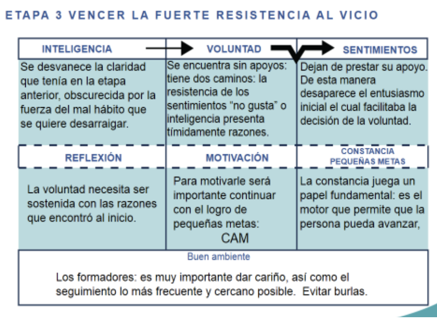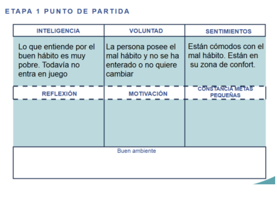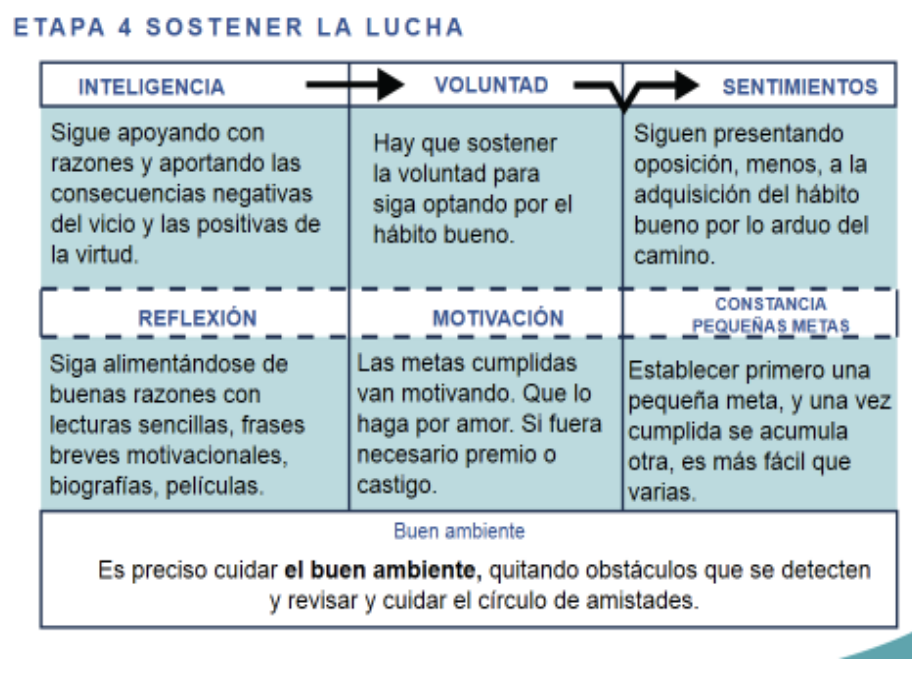 Y nos preguntamos ¿cómo lograr que la voluntad venza la fuerte resistencia inicial de la sensibilidad bajo la guía de las razones que le propone la inteligencia? El reto más difícil para adquirir un hábito es la constancia en la práctica de acciones que vayan en esa misma dirección hasta alcanzarlo. Sin embargo, los programas y escuelas que buscan formar en la virtud suelen hacer campañas mostrando distintas virtudes o valores a base de consignas semanales y mensuales; usan como apoyo cuentos, videos y frases; hacen actividades, etc. Por otra parte, preceptores y psicólogos, solo proponen metas para que las personas mejoren en distintos aspectos, pero no se suele proponer un programa de seguimiento a largo plazo. Se observa que este camino no ha sido suficiente, de ahí este interés por educar mejor el carácter en América Latina, como lo hemos hecho a lo largo de varios lustros. La cuestión para preguntarse es la siguiente: ¿cuál es el proceso interior que atraviesa la persona desde que es consciente de que carece del buen hábito que desea, hasta conseguir adquirirlo? Es esencial saberlo para buscar las estrategias y medios a poner, tanto por la persona interesada como por parte de los formadores, si queremos formar hábitos buenos que conforman el carácter.